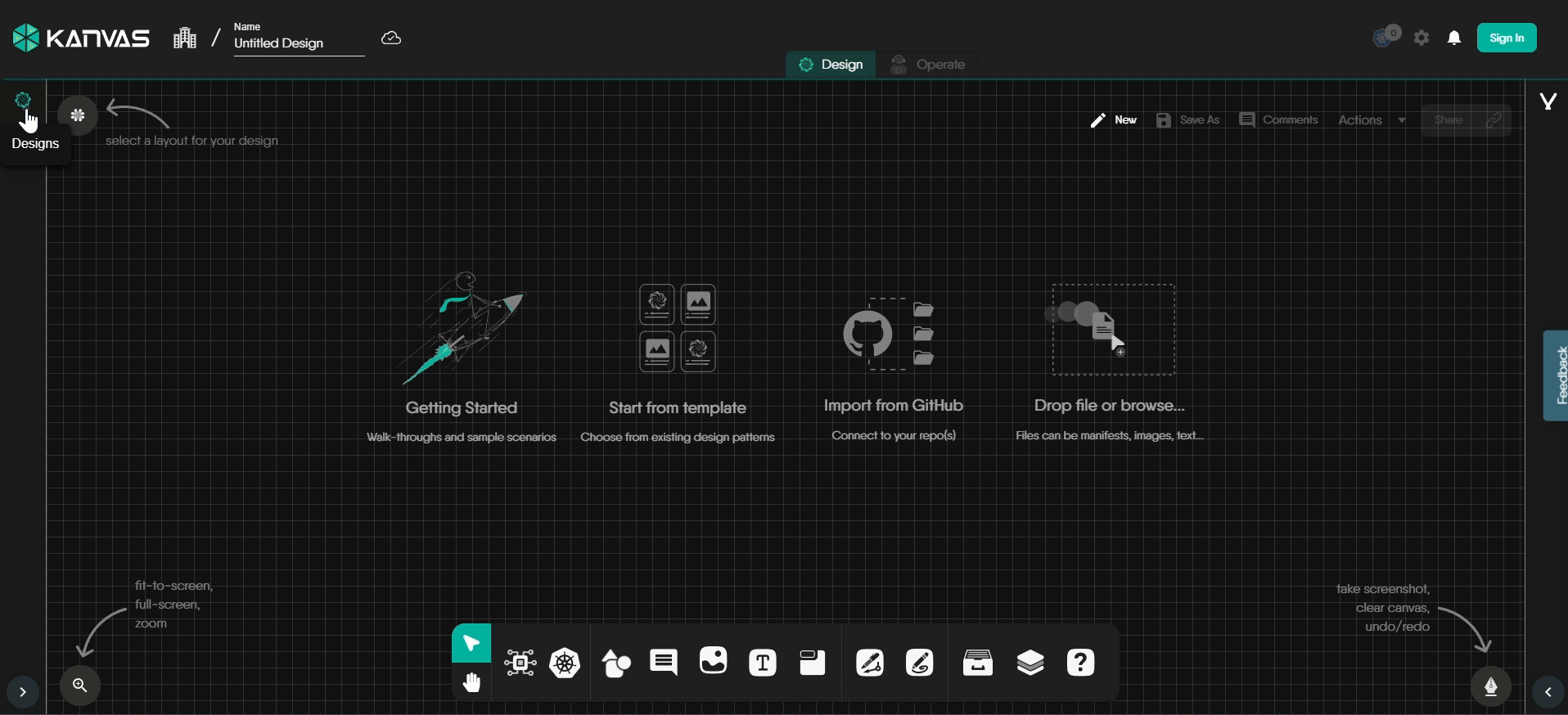 • Access the Kanvas Designer and select the "Import" button in the left Designs panel. Import your own designs from local filesystem or from a remote URL directly into the Catalog. Upload a file or provide a URL for Docker Compose, Helm Charts, Meshery Designs or Kubernetes Manifests. Choose to either import as new or merge into current design that you have open in Kanvas.